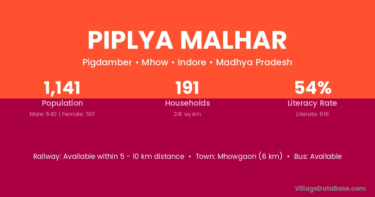 Mhowgaon (6 km) is the nearest town to Piplya Malhar village for major economic activities and is located approximately 6 km away.