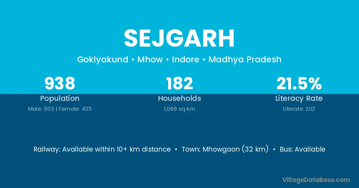 Mhowgaon (32 km) is the nearest town to Sejgarh village for major economic activities and is located approximately 32 km away.