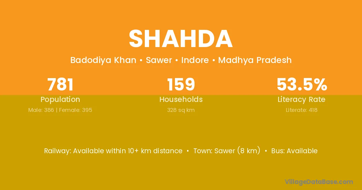 Mhowgaon (2 km) is the nearest town to Shahda village for major economic activities and is located approximately 2 km away.