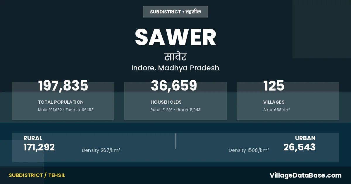 According to the 2011 census The total area of Sawer Tehsil is 658 km², with a population of 197835 people. The population density is 301 inhabitants per square kilometre, and there are approximately 36659 houses in the sub district.