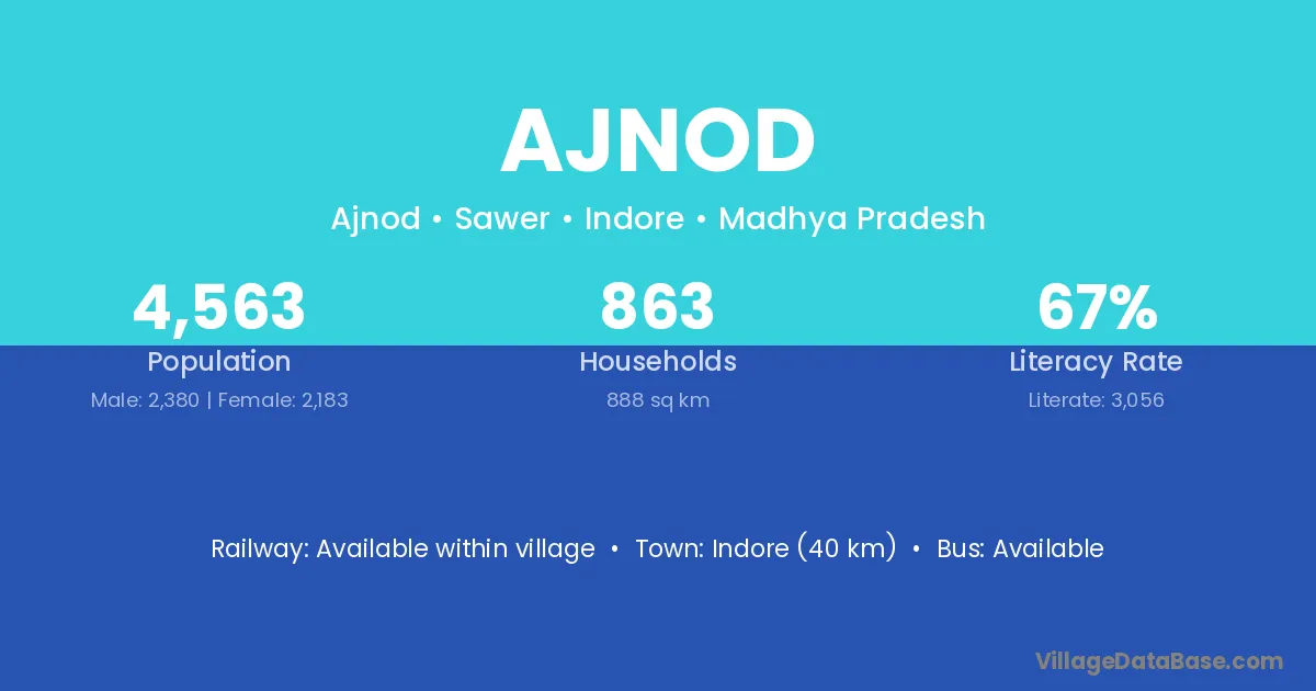 Indore (40 km) is the nearest town to Ajnod village for major economic activities and is located approximately 40 km away.