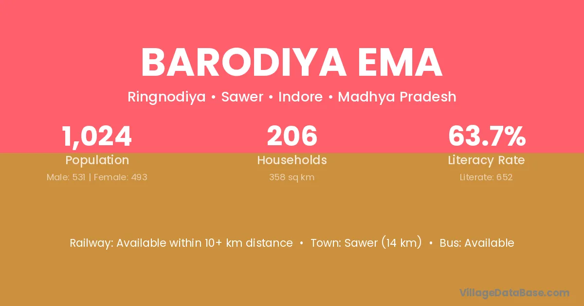 Barodiya Ema village has a total population of 1,024 people, of which 531 are males and 493 are females.