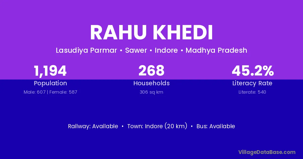 Indore (20 km) is the nearest town to Rahu Khedi village for major economic activities and is located approximately 20 km away.