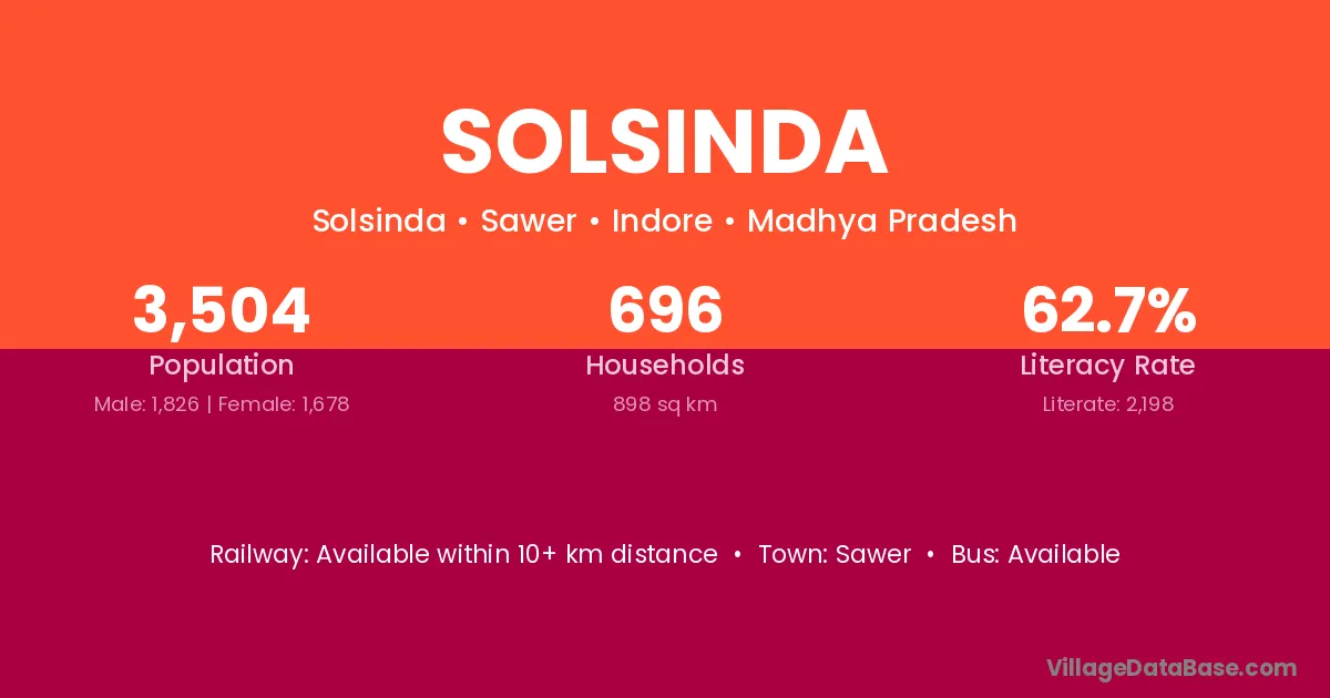Solsinda village has a total population of 3,504 people, of which 1,826 are males and 1,678 are females.