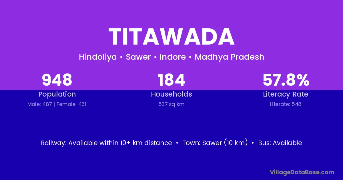 Titawada village has a total population of 948 people, of which 487 are males and 461 are females.