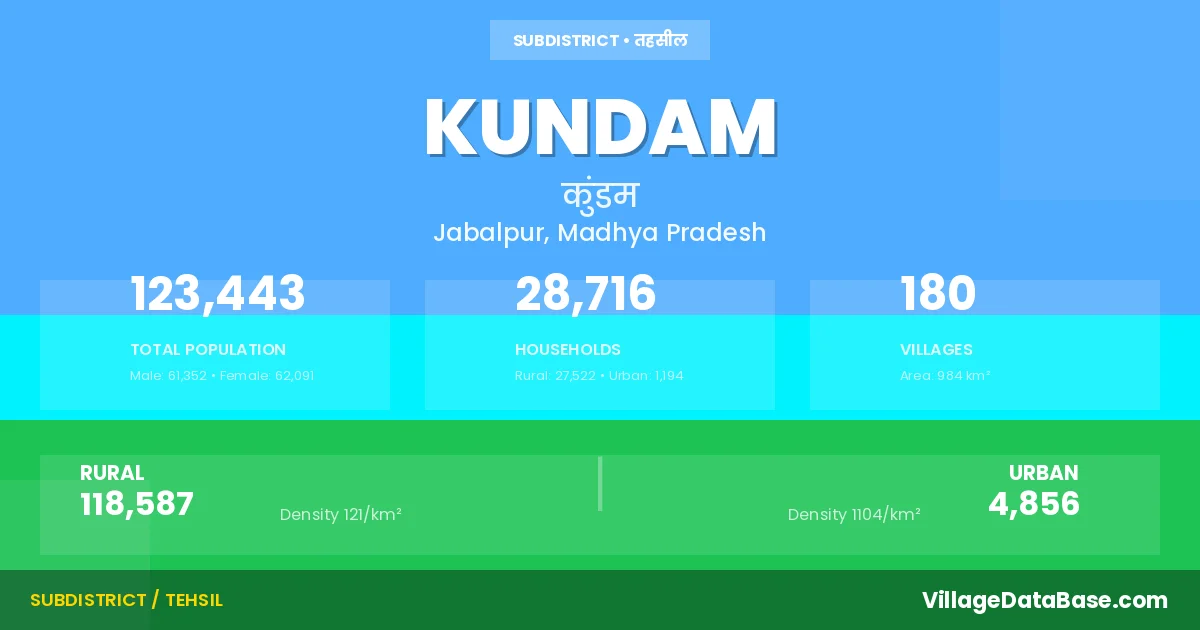 Kundam is a town and Tehsil in the Jabalpur district of the Madhya Pradesh. In India, a Tehsil is a subdivision of a district responsible for the administration and revenue collection of a specific area within the district. Tehsils play a crucial role in the local governance structure, contributing significantly to the development and administration of their communities.