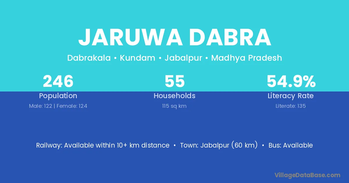 Jabalpur (60 km) is the nearest town to Jaruwa Dabra village for major economic activities and is located approximately 60 km away.