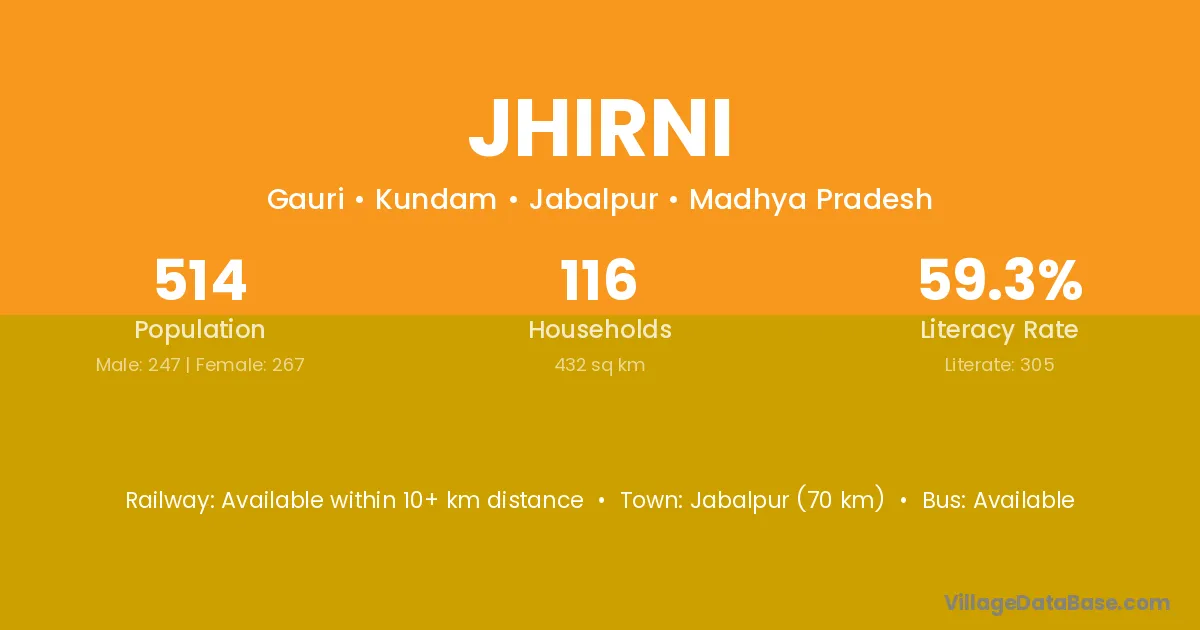 Jabalpur (70 km) is the nearest town to Jhirni village for major economic activities and is located approximately 70 km away.