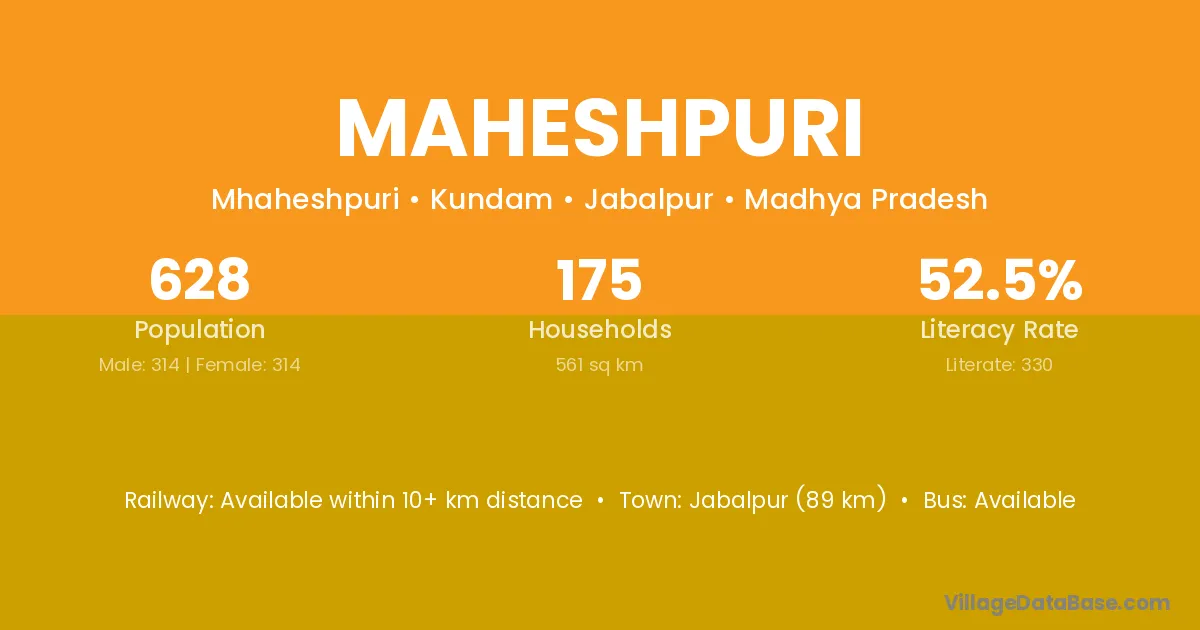 Jabalpur (89 km) is the nearest town to Maheshpuri village for major economic activities and is located approximately 89 km away.