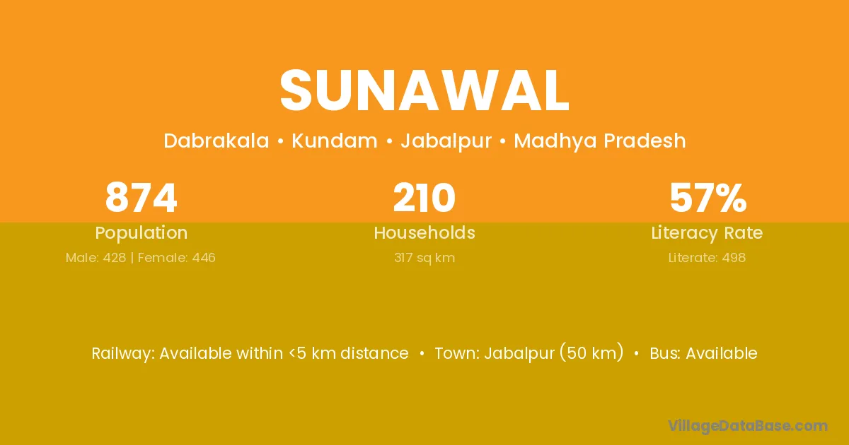 Jabalpur (50 km) is the nearest town to Sunawal village for major economic activities and is located approximately 50 km away.