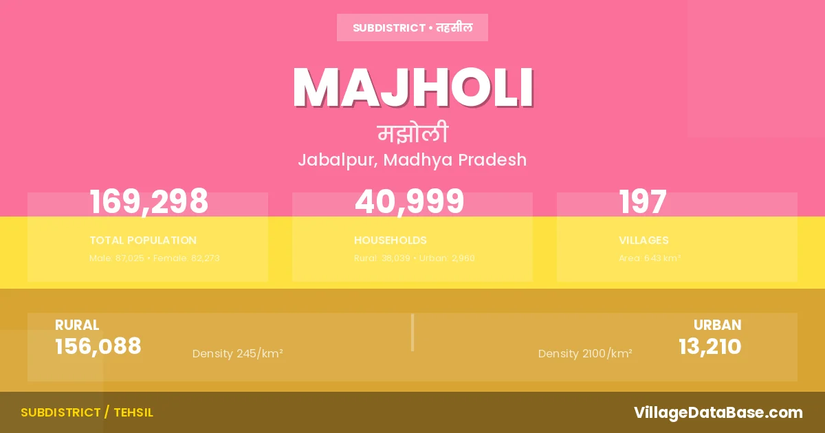 According to the 2011 census The total area of Majholi Tehsil is 643 km², with a population of 169298 people. The population density is 263 inhabitants per square kilometre, and there are approximately 40999 houses in the sub district.