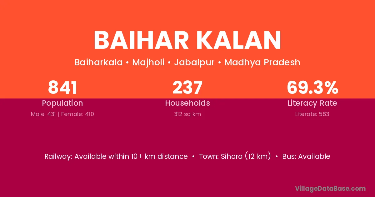 Sihora (12 km) is the nearest town to Baihar Kalan village for major economic activities and is located approximately 12 km away.