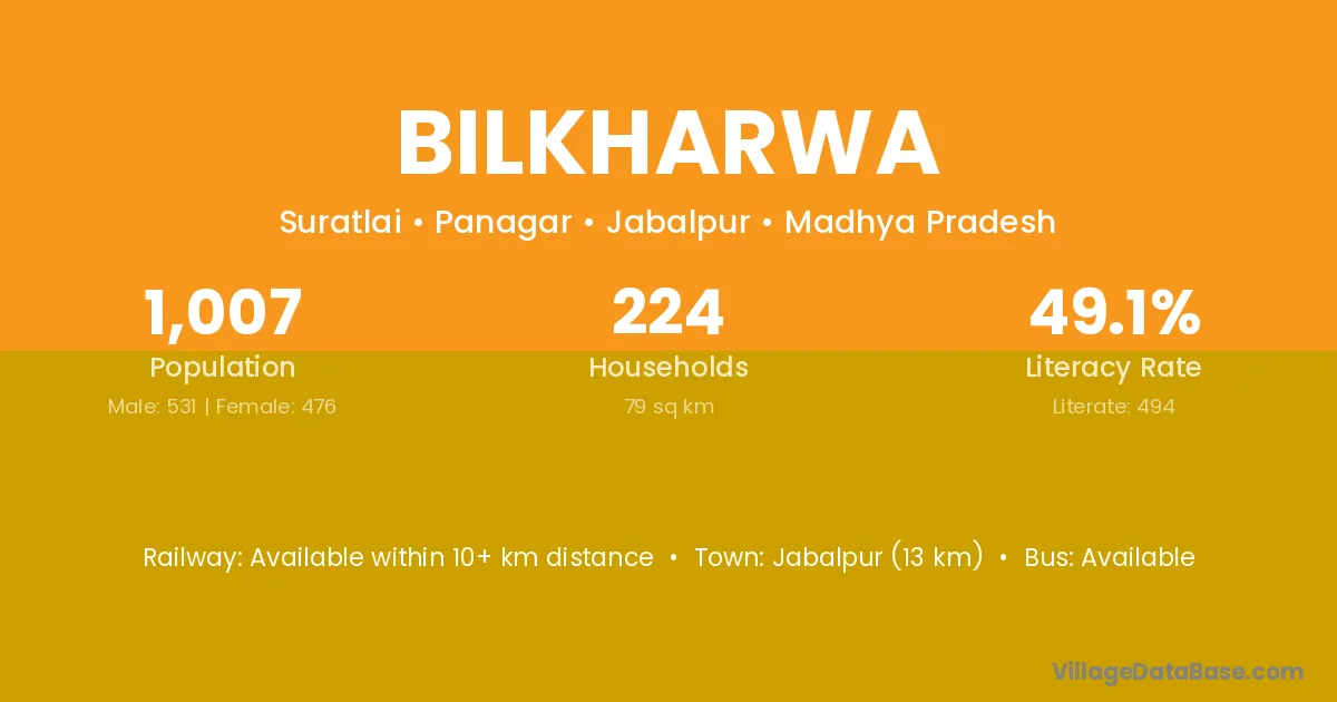Jabalpur (13 km) is the nearest town to Bilkharwa village for major economic activities and is located approximately 13 km away.