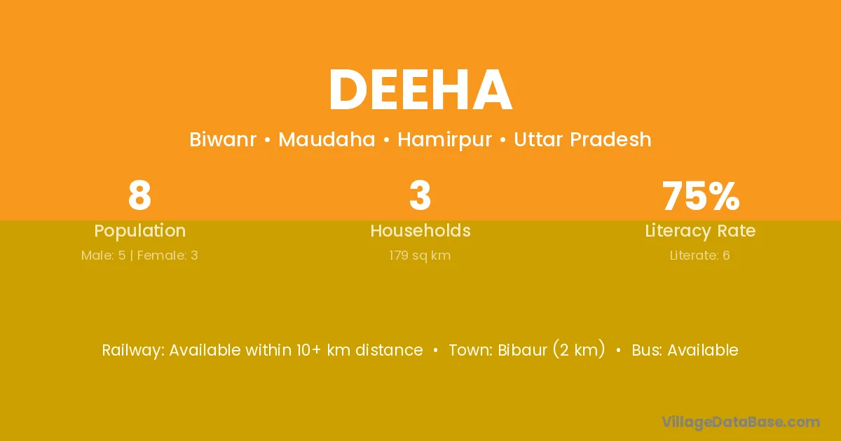 Deeha village has a total population of 123 people, of which 65 are males and 58 are females.