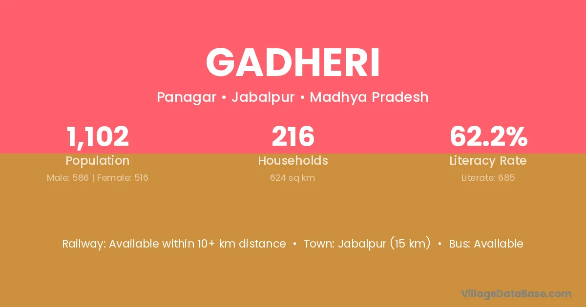 Jabalpur (15 km) is the nearest town to Gadheri village for major economic activities and is located approximately 15 km away.