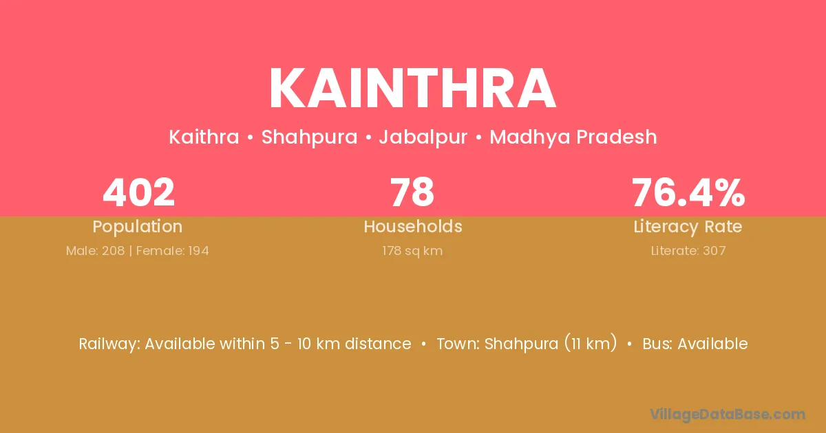 Jabalpur (25 km) is the nearest town to Kainthra village for major economic activities and is located approximately 25 km away.