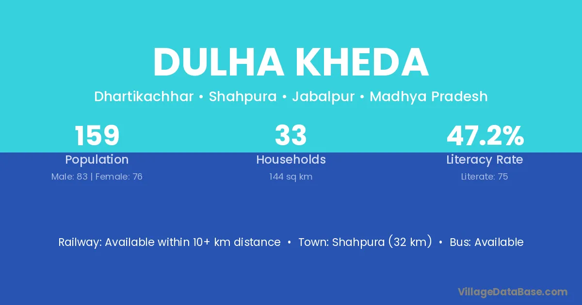 Dulha Kheda village has a total population of 159 people, of which 83 are males and 76 are females.