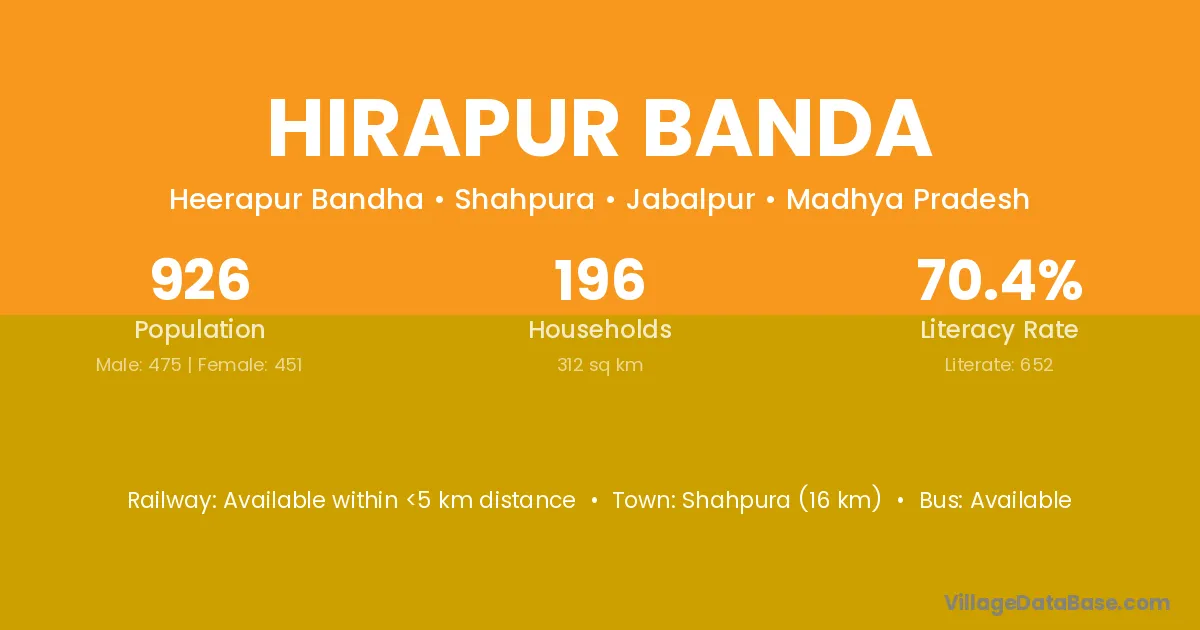 Shahpura (16 km) is the nearest town to Hirapur Banda village for major economic activities and is located approximately 16 km away.