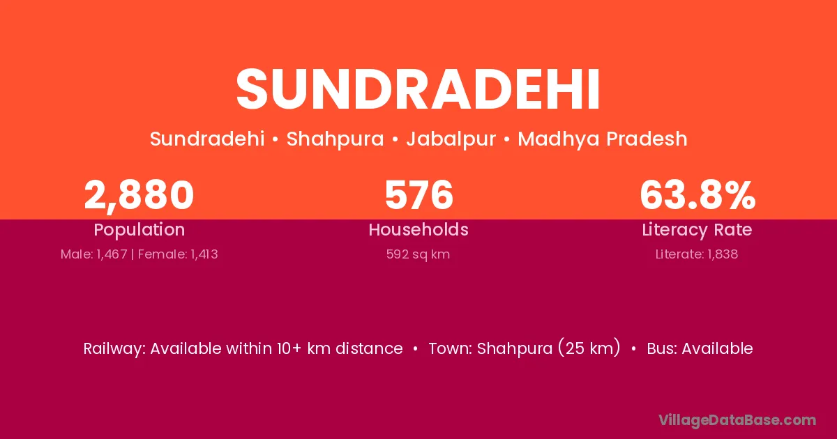 Sundradehi village has a total population of 2,880 people, of which 1,467 are males and 1,413 are females.