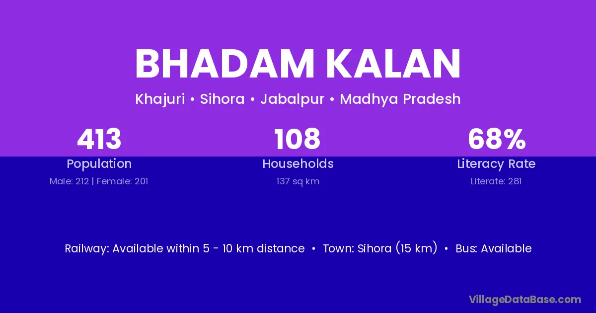 Sihora (15 km) is the nearest town to Bhadam Kalan village for major economic activities and is located approximately 15 km away.
