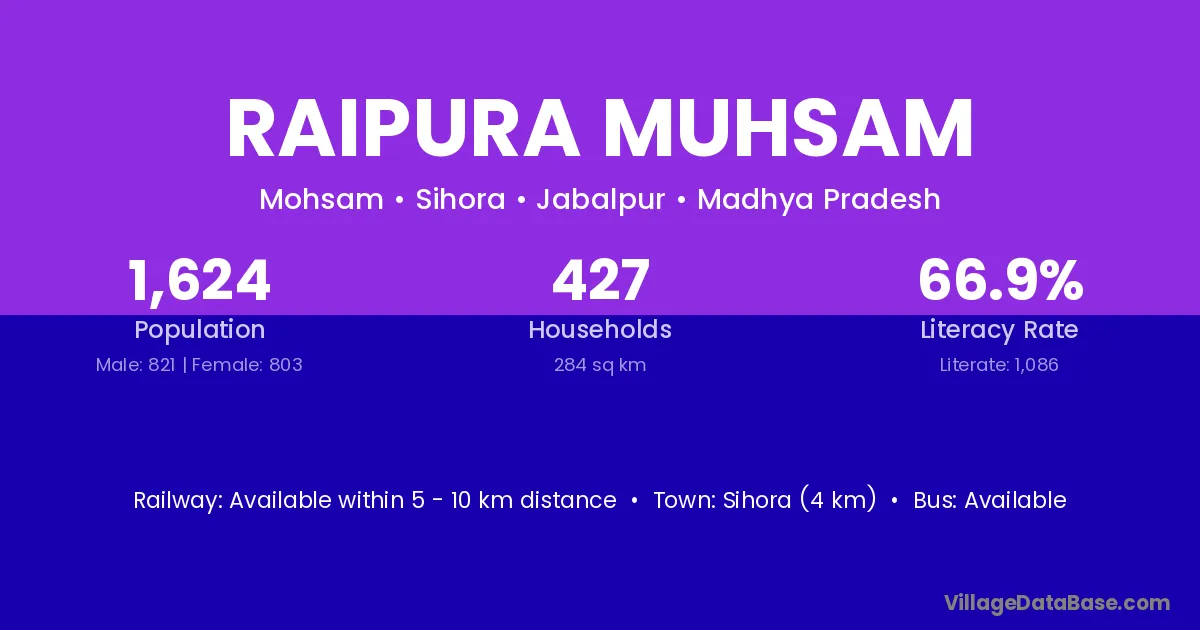 Sihora (4 km) is the nearest town to Raipura Muhsam village for major economic activities and is located approximately 4 km away.