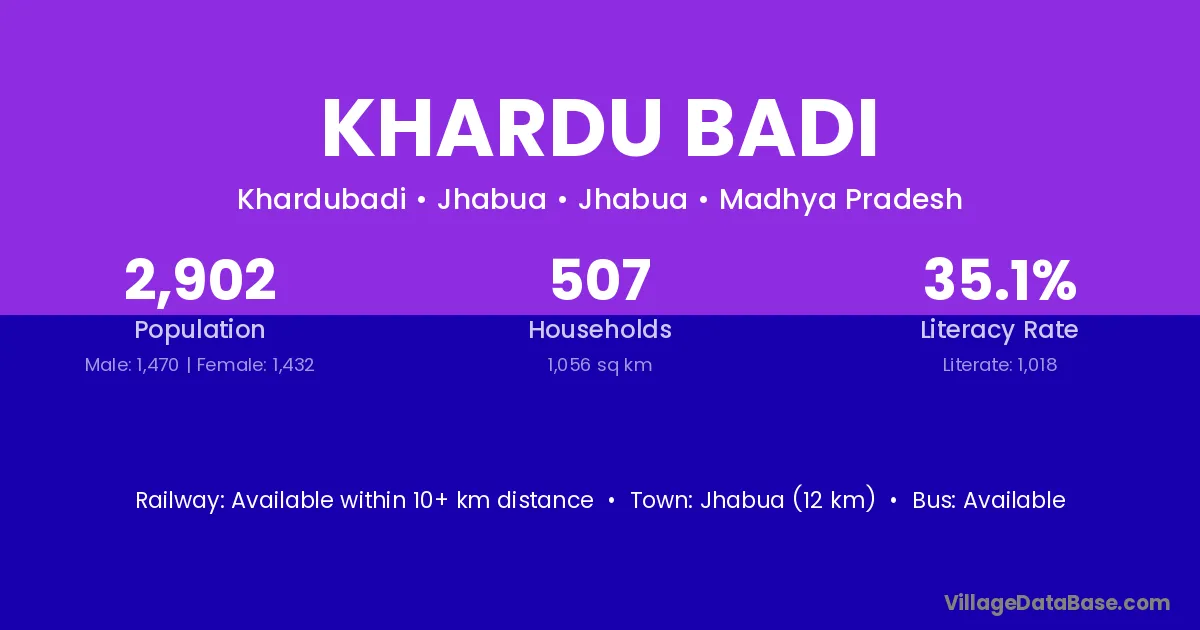 Jhabua (12 km) is the nearest town to Khardu Badi village for major economic activities and is located approximately 12 km away.