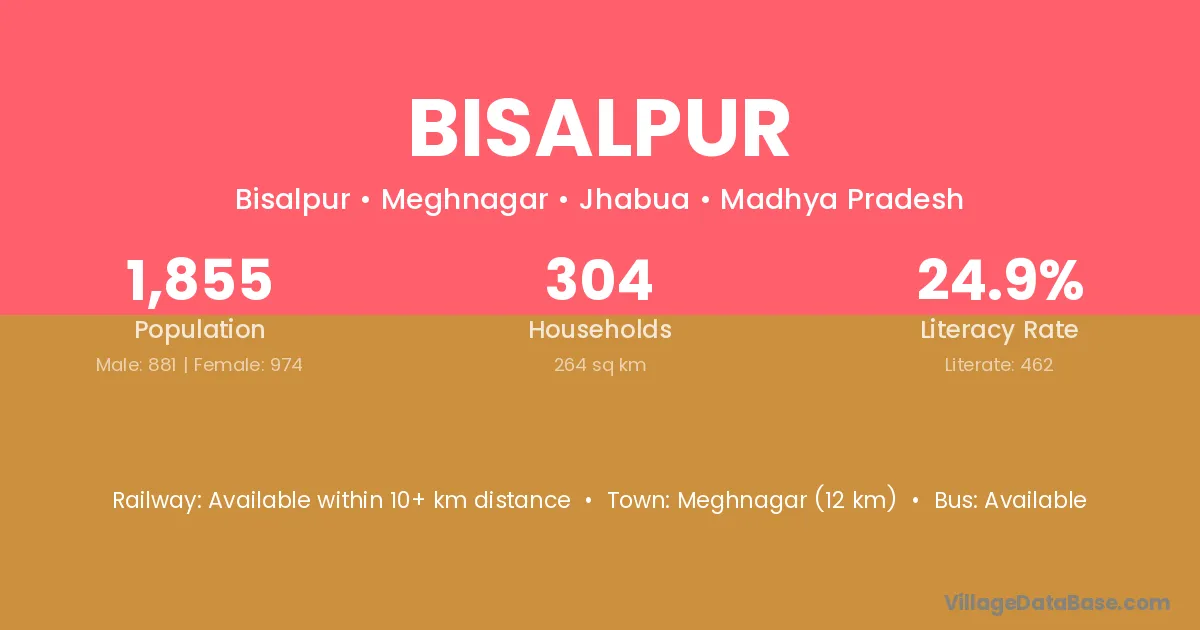 Meghnagar (12 km) is the nearest town to Bisalpur village for major economic activities and is located approximately 12 km away.