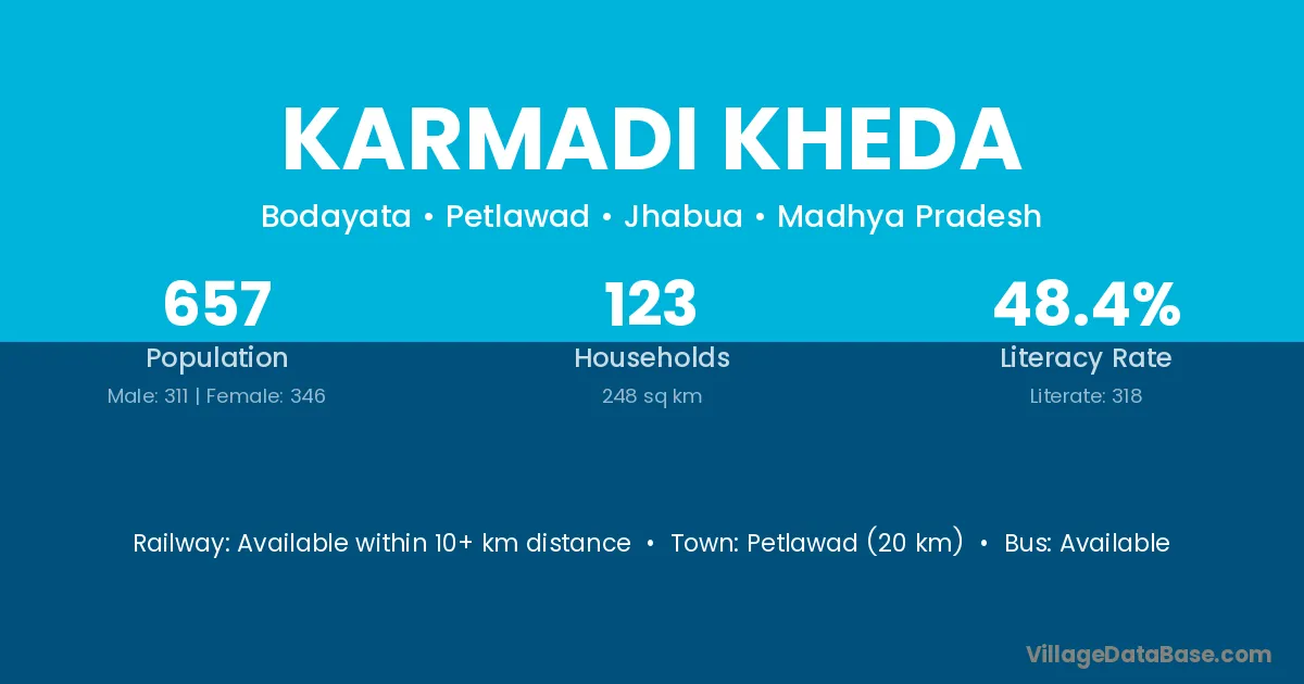 Petlawad (20 km) is the nearest town to Karmadi Kheda village for major economic activities and is located approximately 20 km away.