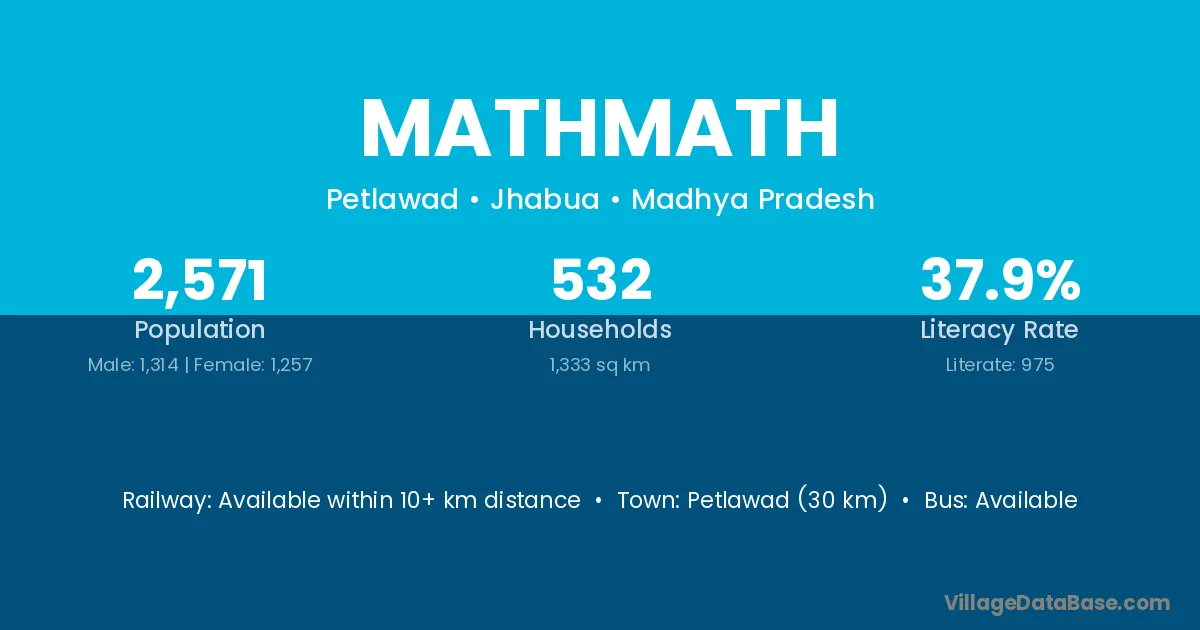 Petlawad (30 km) is the nearest town to Mathmath village for major economic activities and is located approximately 30 km away.