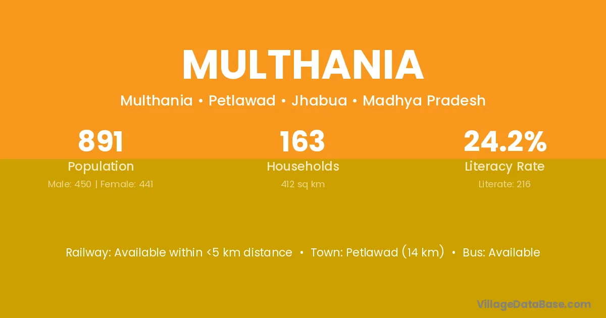 Petlawad (14 km) is the nearest town to Multhania village for major economic activities and is located approximately 14 km away.