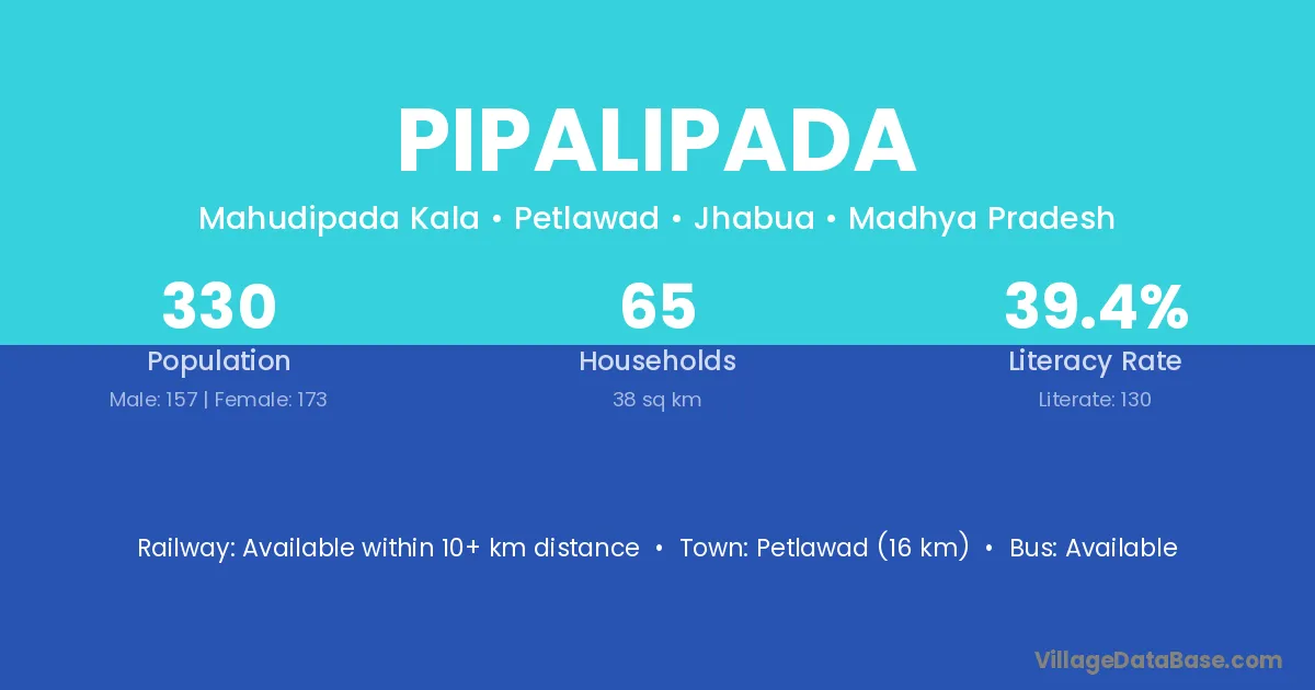 Petlawad (16 km) is the nearest town to Pipalipada village for major economic activities and is located approximately 16 km away.