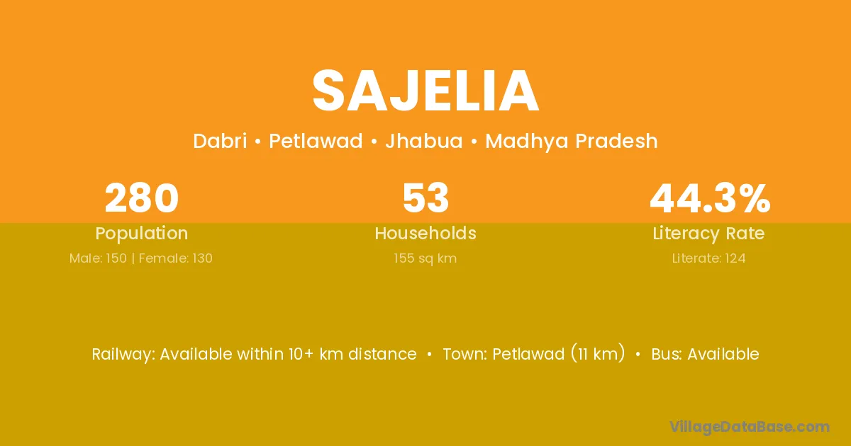 Petlawad (11 km) is the nearest town to Sajelia village for major economic activities and is located approximately 11 km away.
