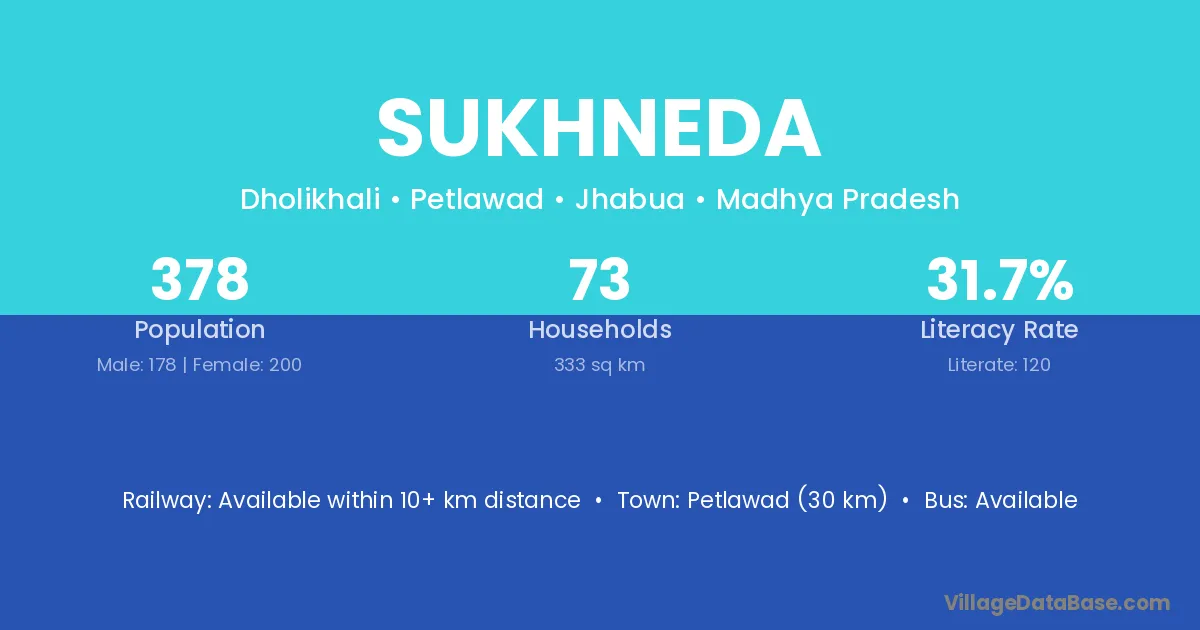 Petlawad (30 km) is the nearest town to Sukhneda village for major economic activities and is located approximately 30 km away.