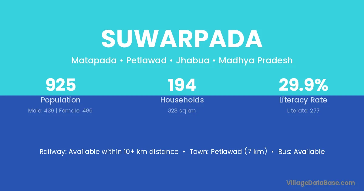 Petlawad (7 km) is the nearest town to Suwarpada village for major economic activities and is located approximately 7 km away.