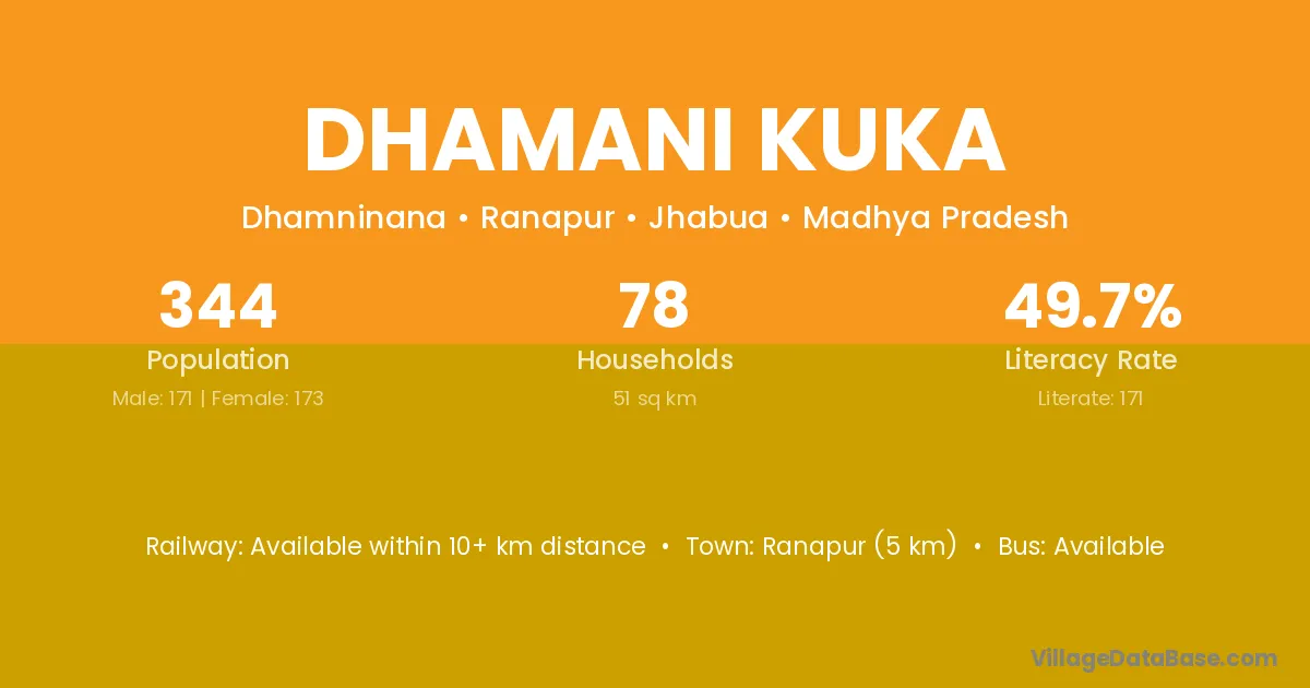 Dhamani Kuka village has a total population of 344 people, of which 171 are males and 173 are females.