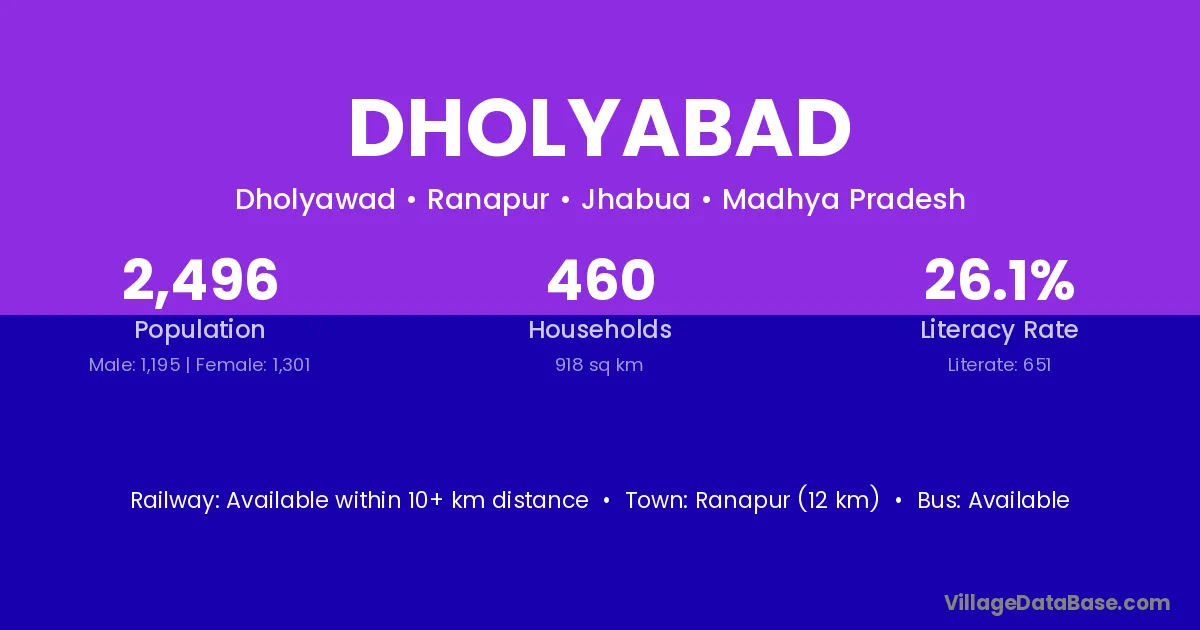 Ranapur (12 km) is the nearest town to Dholyabad village for major economic activities and is located approximately 12 km away.