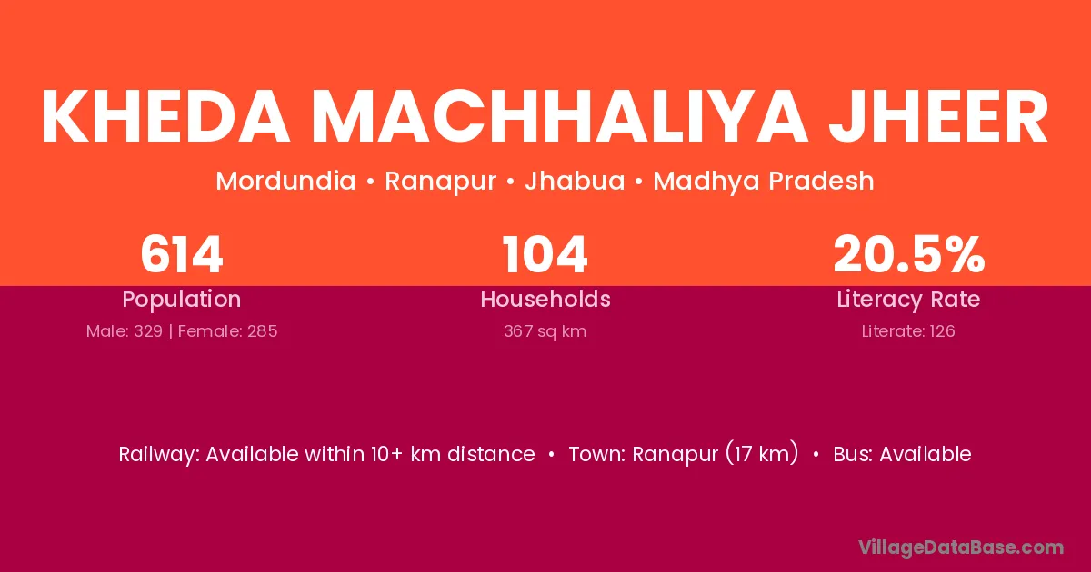 Kheda Machhaliya Jheer village has a total population of 614 people, of which 329 are males and 285 are females.