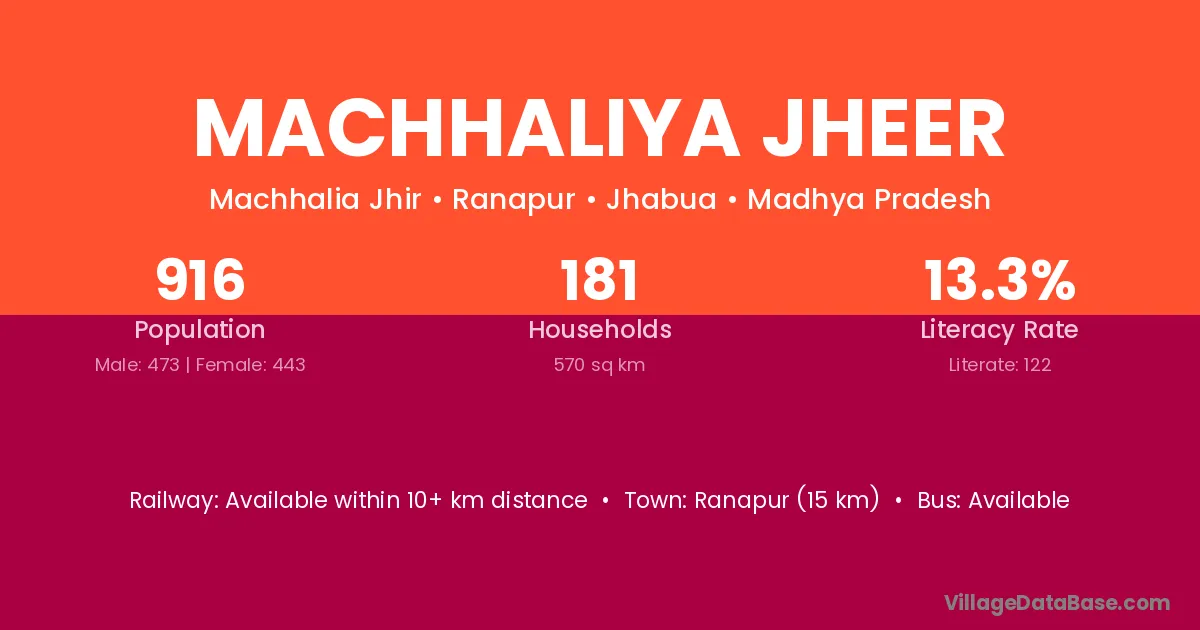 Machhaliya Jheer village has a total population of 916 people, of which 473 are males and 443 are females.
