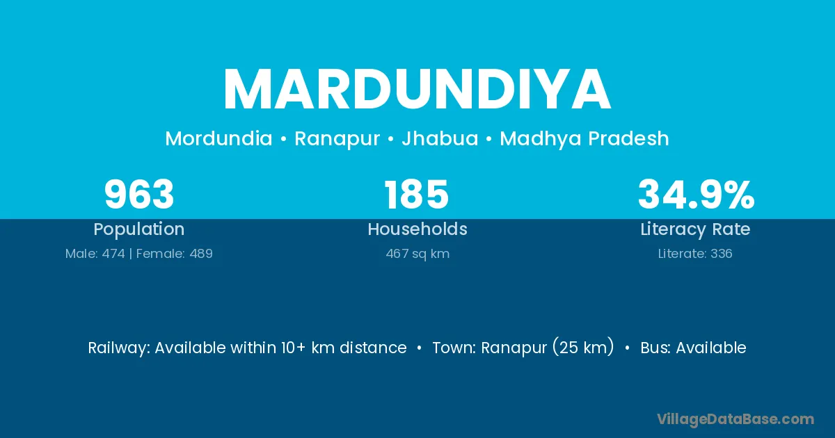 Ranapur (25 km) is the nearest town to Mardundiya village for major economic activities and is located approximately 25 km away.