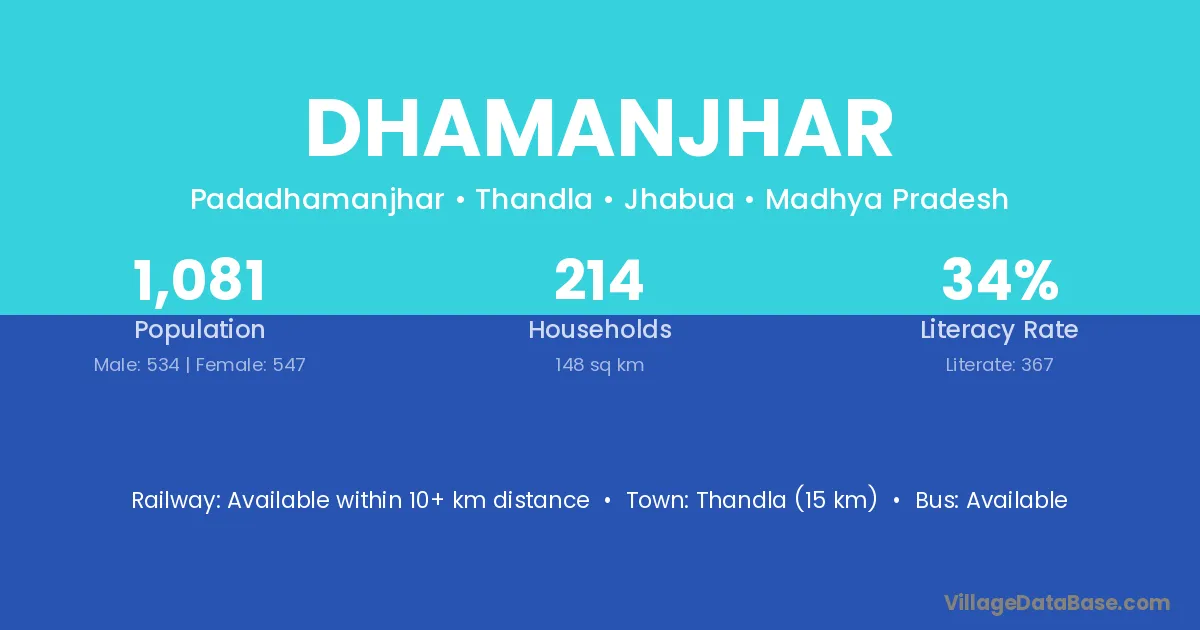 Thandla (15 km) is the nearest town to Dhamanjhar village for major economic activities and is located approximately 15 km away.