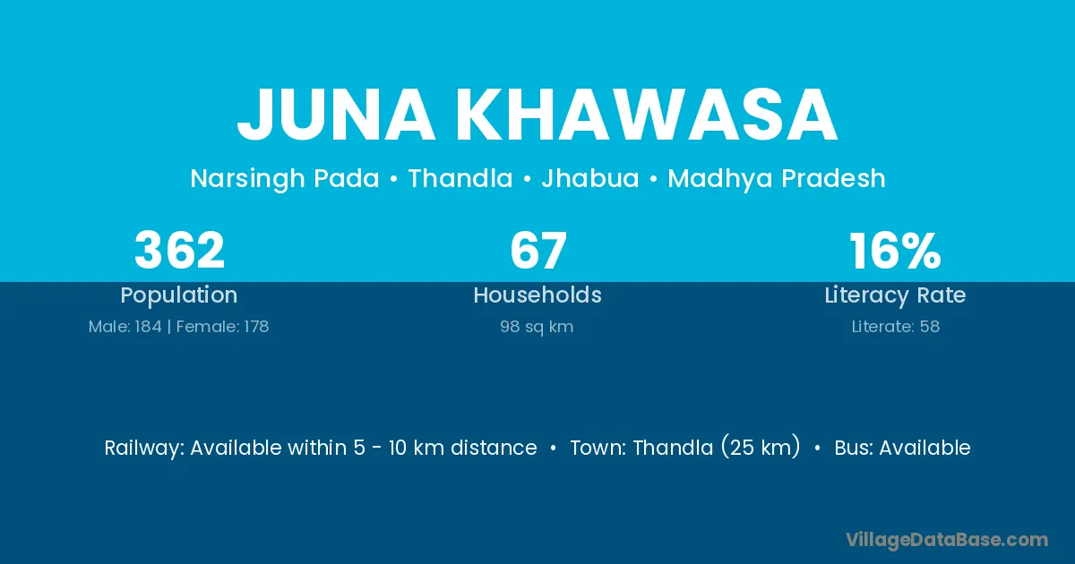Thandla (25 km) is the nearest town to Juna Khawasa village for major economic activities and is located approximately 25 km away.