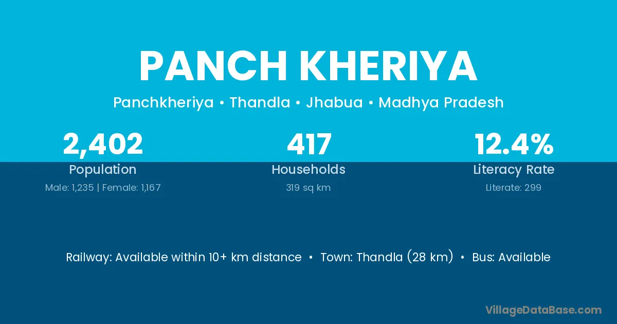 Thandla (28 km) is the nearest town to Panch Kheriya village for major economic activities and is located approximately 28 km away.