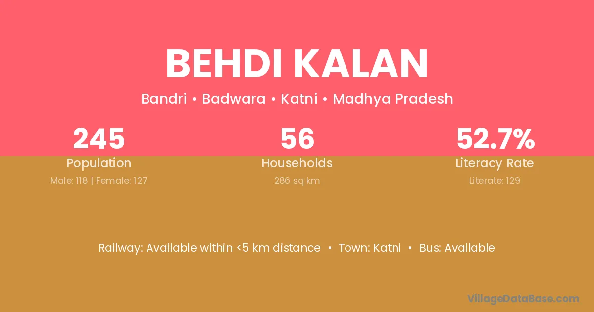 Behdi Kalan village has a total population of 245 people, of which 118 are males and 127 are females.