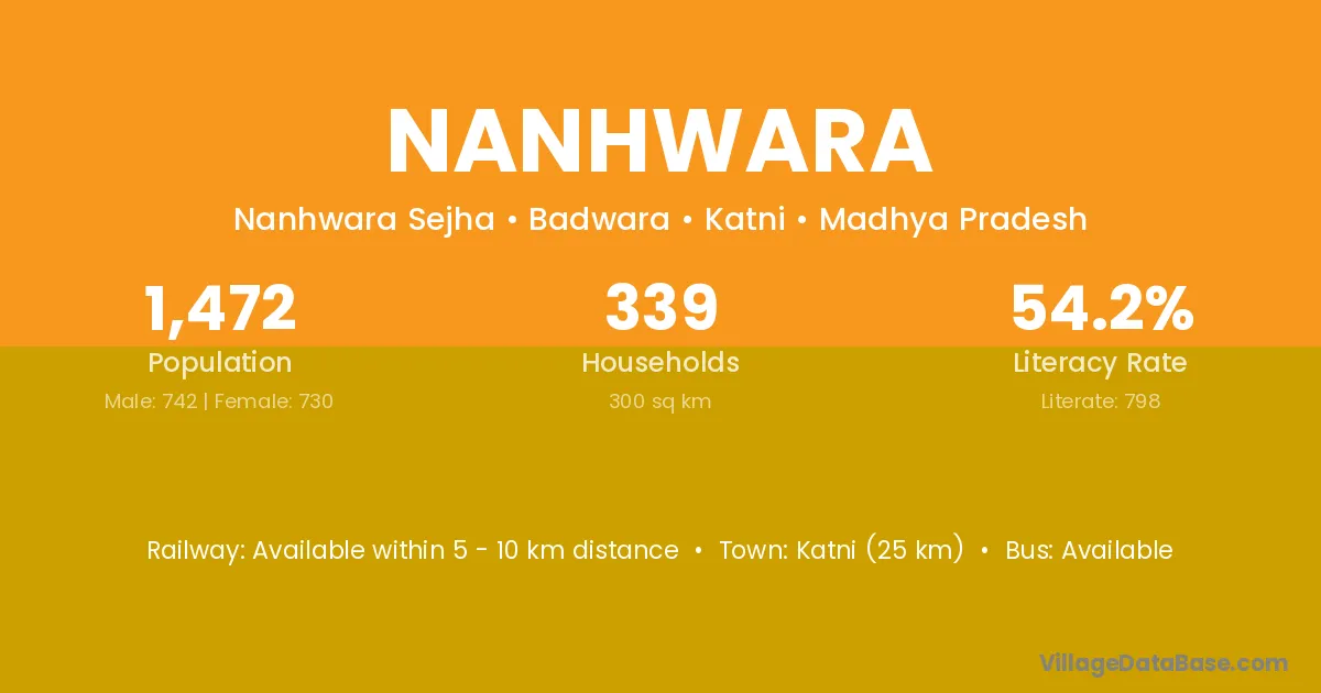 Katni (25 km) is the nearest town to Nanhwara village for major economic activities and is located approximately 25 km away.
