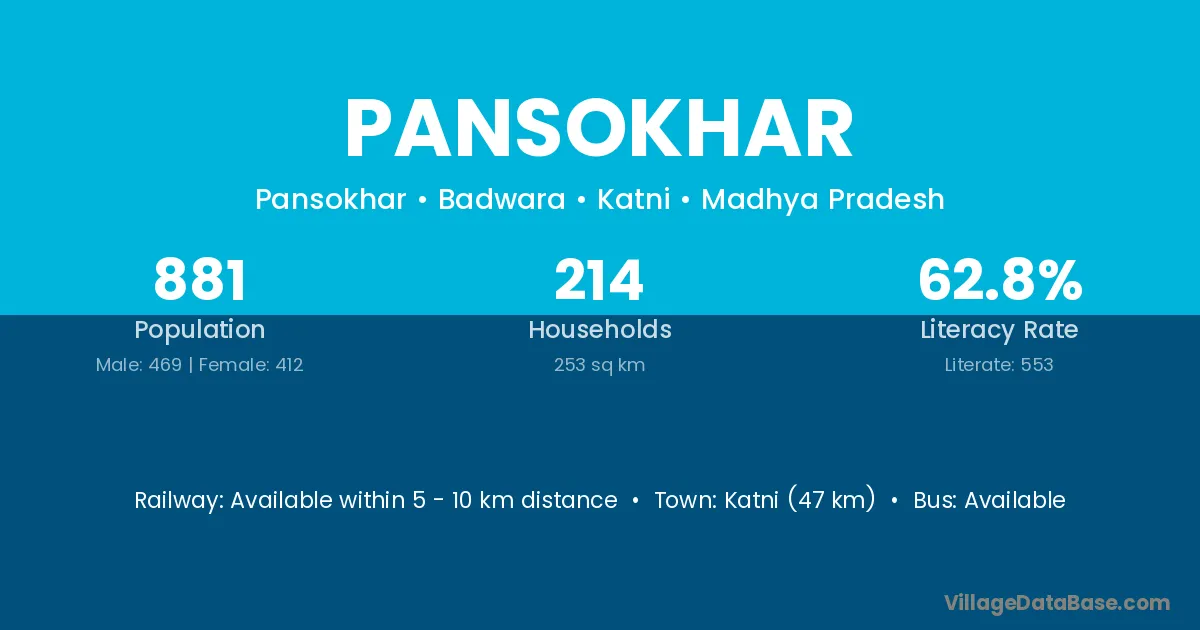Katni (47 km) is the nearest town to Pansokhar village for major economic activities and is located approximately 47 km away.