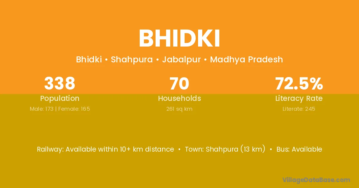 Katni (50 km) is the nearest town to Bhidki village for major economic activities and is located approximately 50 km away.