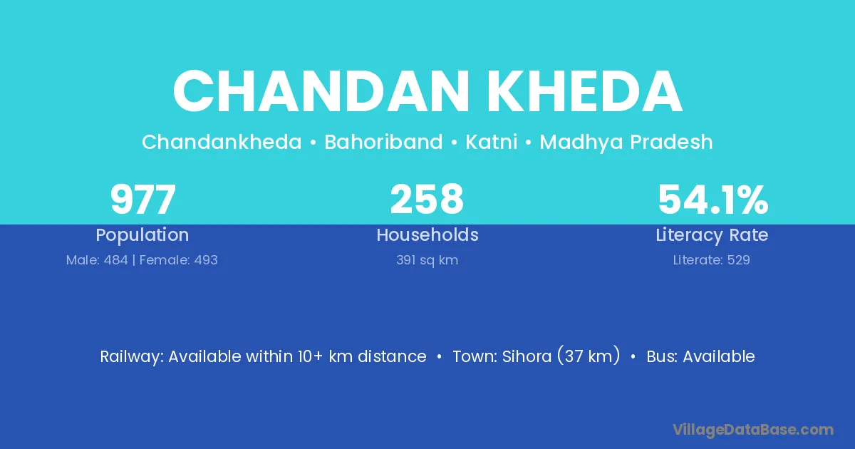 Chandan Kheda village has a total population of 977 people, of which 484 are males and 493 are females.