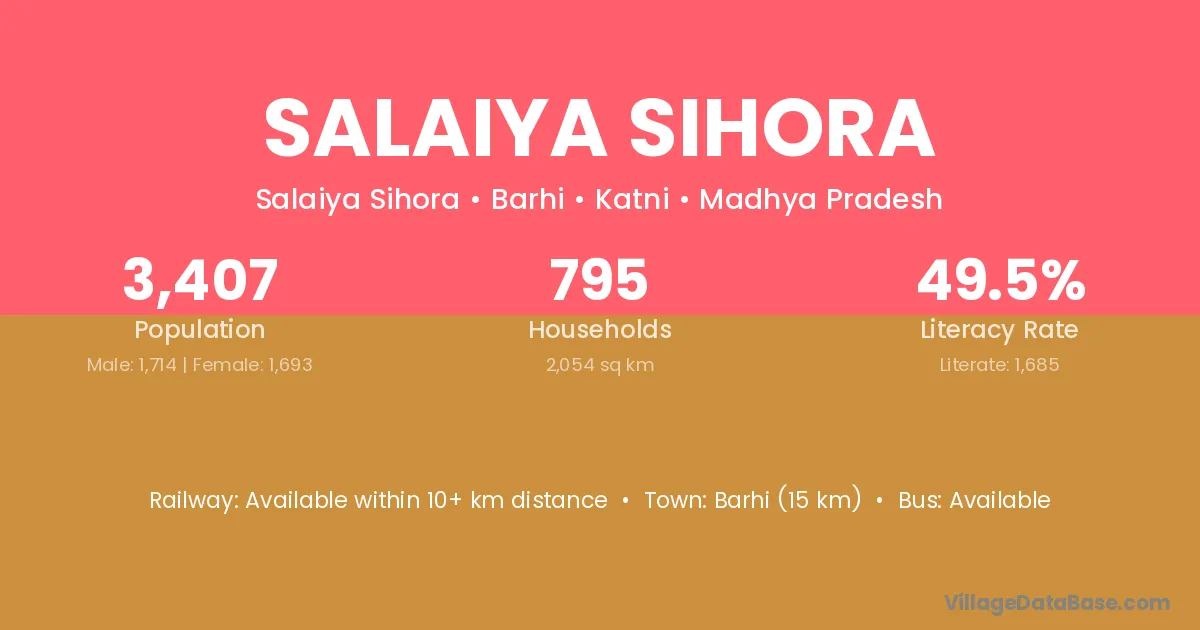 Salaiya Sihora village has a total population of 3,407 people, of which 1,714 are males and 1,693 are females.