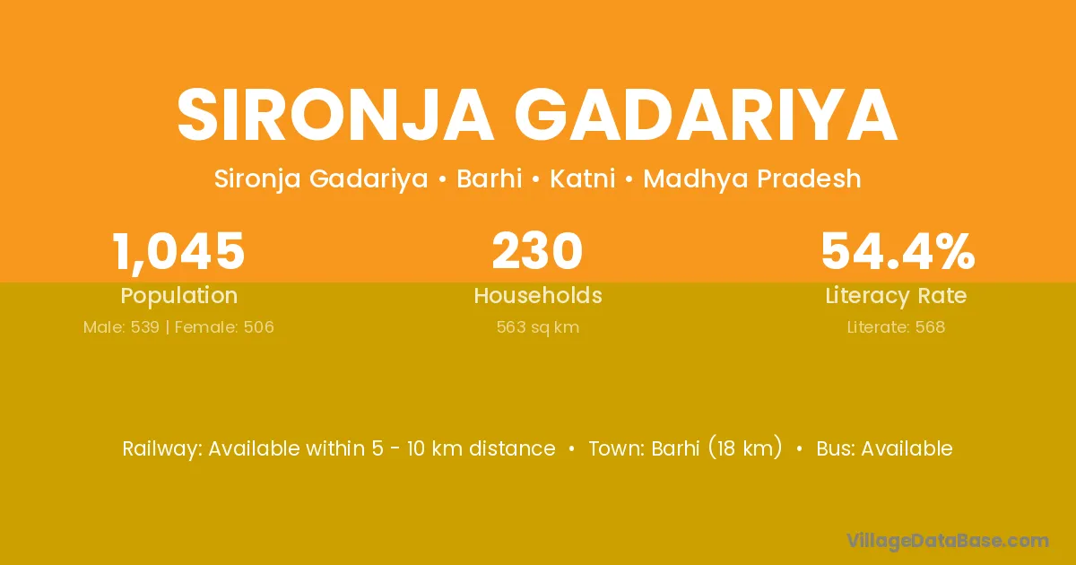 Barhi (18 km) is the nearest town to Sironja Gadariya village for major economic activities and is located approximately 18 km away.