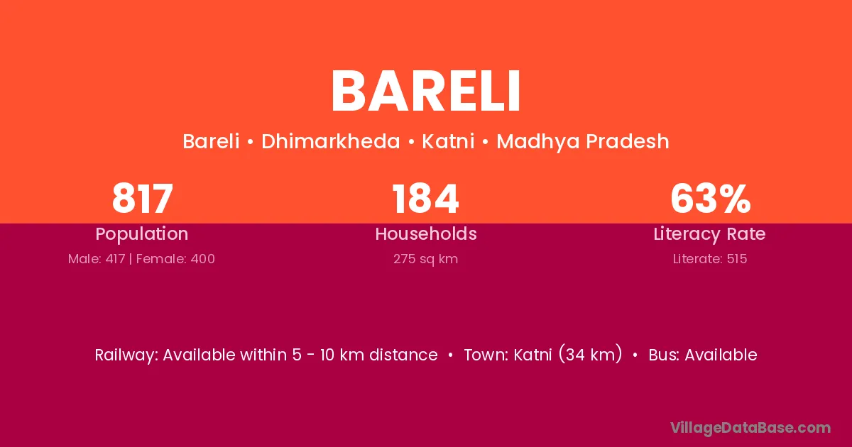 Katni (34 km) is the nearest town to Bareli village for major economic activities and is located approximately 34 km away.